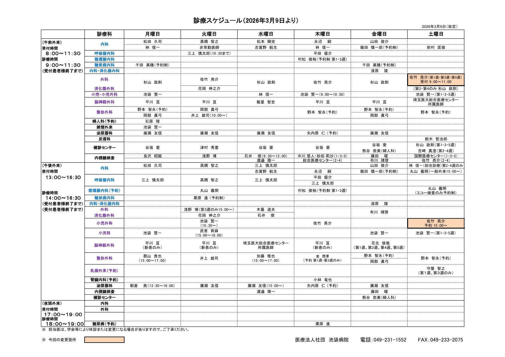 | 小児科・小児外科 | 池袋 | 武者 (15:00~18:00) | 池袋 | 池袋 (第1・3・5週) |